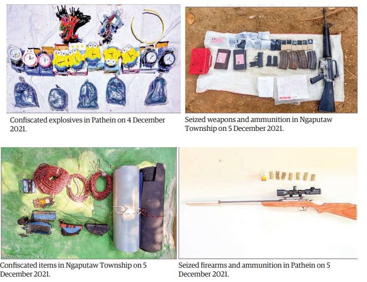 A total of 14 men and 2 women were arrested with four types of weapon, eight magazines, 203 rounds of ammunition, three mines, 55 detonators, five bags of gunpowder, three pipes prepared to make homemade guns, one laptop, two compasses, and related explosives between 2 and 5 December in Pathein Township, Ayeyawady Region.