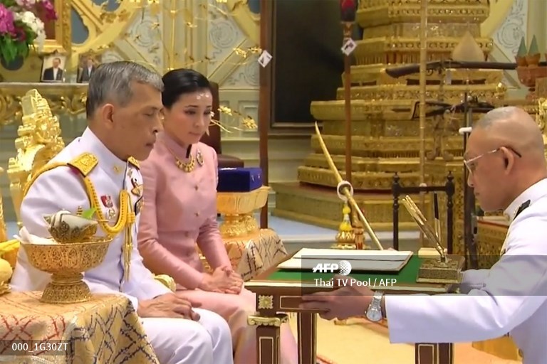 The ceremony was overseen by Vajiralongkorn wearing a white uniform in Bangkok's Dusit Palace Wednesday, according to a broadcast of the announcement, which showed Queen Suthida in a traditional Thai silk dress.