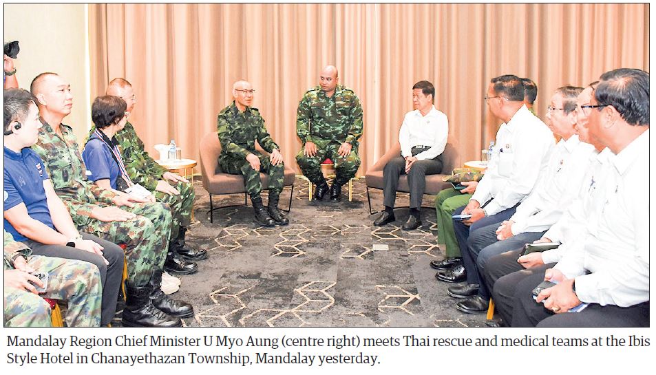 MANDALAY Region Chief Minister U Myo Aung met a 21-member Thai rescue team led by Colonel Thoetsak Jaiaree and a 27-member Thai medical team led by Dr Patthaphong Pracijasontikul at the Ibis Style Hotel Mandalay Centre in Chanayethazan Township yesterday morning.