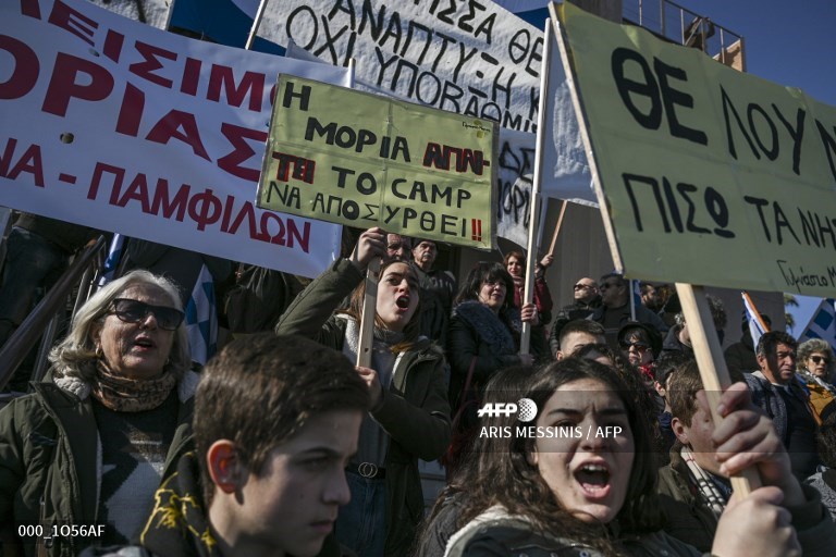 The islanders of Lesbos, Samos and Chios staged a general strike, shutting down shops and public services and rallying in central squares, many waving Greek flags.