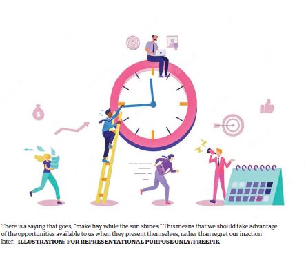 There is a saying that goes, “make hay while the sun shines.” This means that we should take advantage of the opportunities available to us when they present themselves, rather than regret our inaction later. If we do not use our precious time wisely, we will undoubtedly experience the greatest regrets in life. There­fore, managing our time well allows us to live peacefully and without regrets in the future.