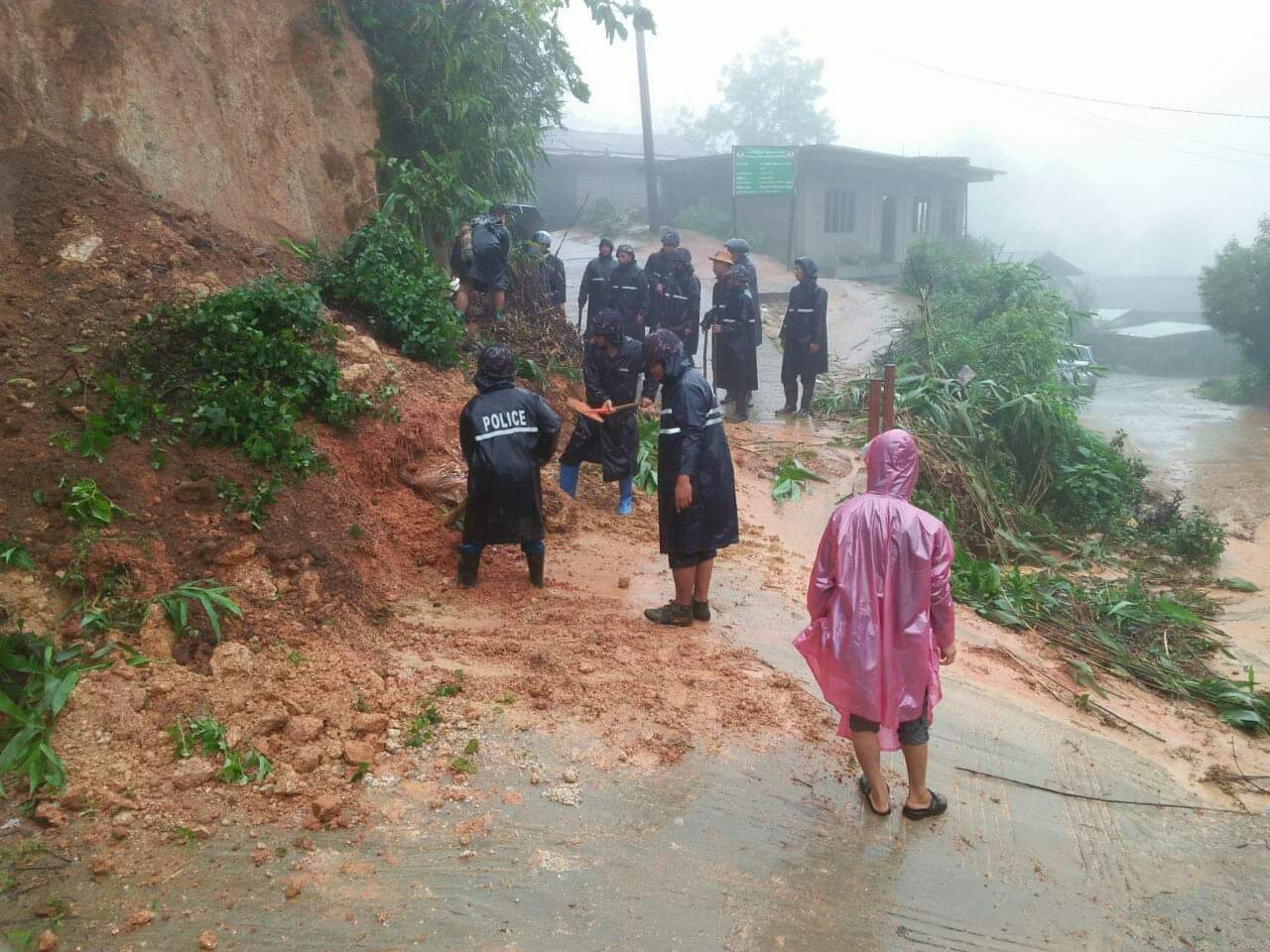 This morning, a landslide happened at the junction of Leiktho and Cherry Roads. Therefore, departmental officials rushed to the scene and cleared the landslide with the help of bulldozer. Accordingly, local residents can travel safely starting from 11 am.