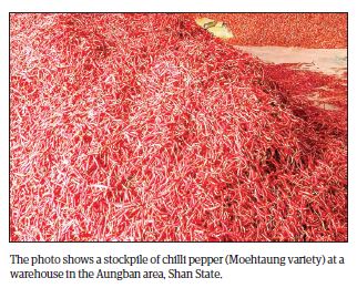 The prices of long chilli peppers processed at cold storage were K13,500-14,500 per viss in the wholesale market at present. As the market is sluggish and the possibility of a price rise is extremely low, we have to reduce the price, U Hla Han stressed. The prices indicated a decrease of K1,000-2,000 per viss these days depending on different varieties.