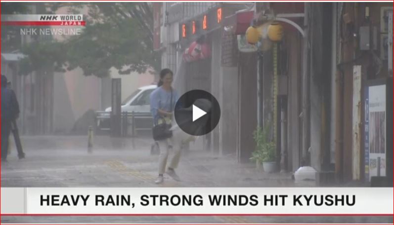 People on Japan's southern island of Kyushu are coping with heavy rain and strong winds after a typhoon made landfall Tuesday morning.