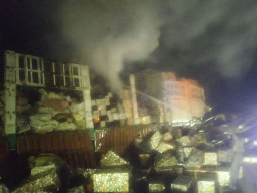The incident occurred on the truck en route from Mandalay to Meikhtila town, which was loaded with old batteries and empty tin cans. Local fire fighters immediately reached the spot and put out the fire using four fire engines and one water truck. No casualties were reported in the fire. The fire was thought to have started from a chemical reaction between empty tin cans and acids leaking from old batteries on the truck.