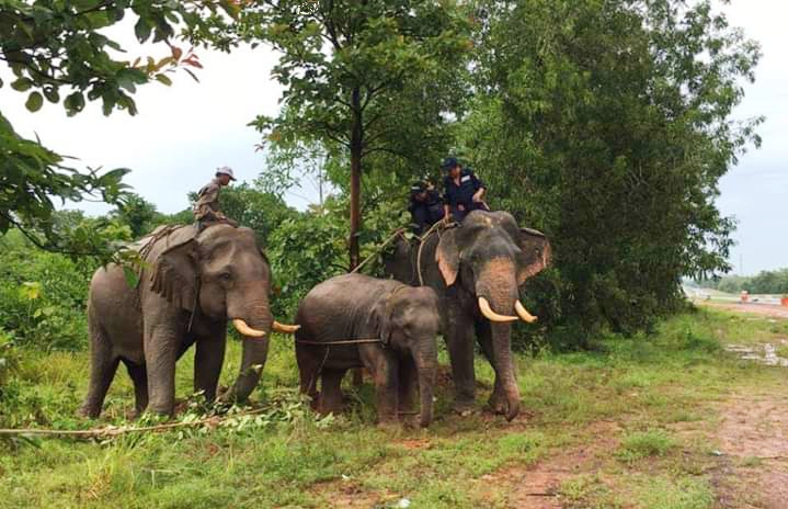 It was reported to the authority that 2 wild elephants were roaming about between mile posts (13/2) and (13/4) . To catch the elephants. Chief forest ranger led a group of rangers and police to track down the elephants. They were found near Zaloat Gyi village in Hlegu township. At about 8 am on August 3rd they went into cashew plantation where the group led by Staff Officer U Tin Htut Oo caught them with tranquilizer using three elephants from Tharyarwady wood enterprise at 8 am. These elephants were given antidote and sent to Bago regional north Zar Mari elephant conservation camp.—Naing Lin (Hlegu) (Translated by Alphonsus)