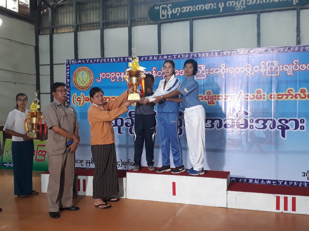 The ceremony was attended by Yangon Region Minister for Social Affairs U Naing Ngan Lin, Director of the Sports and Physical Education Department U Aung Moe, members of the volleyball committee and departmental officials. The SPED director awarded first prize to Western Yangon District men’s volleyball team and Dagon Myothit Township Administrator U Tin Maung Soe presented champion trophy to Western Yangon District women’s volleyball team.