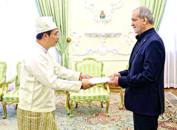 U Zaw Oo, Ambassador Extraordinary and Plenipotentiary of the Republic of the Union of Myanmar to the Islamic Republic of Iran, presented his Credentials to Mr Masoud Pezeshkian, President of the Islamic Republic of Iran, on 10 August 2025, at the Presidential Palace in Tehran. — MNA