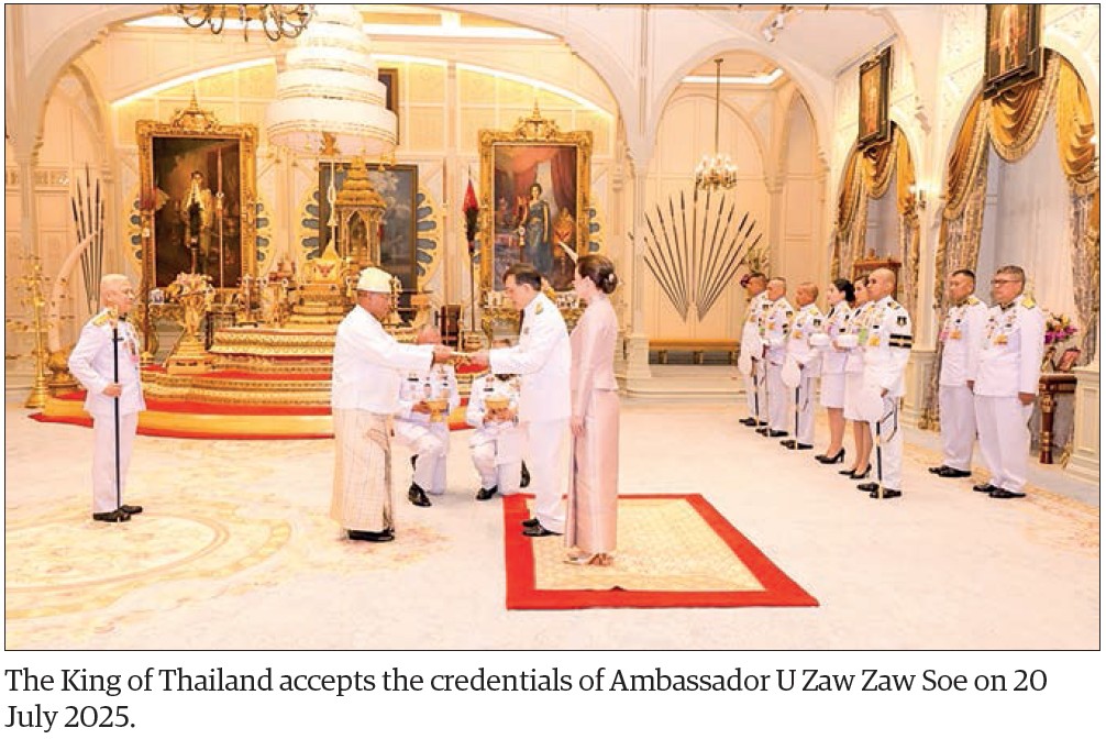 U Zaw Zaw Soe, Ambassador Extraordinary and Plenipotentiary of the Republic of the Union of Myanmar to the Kingdom of Thailand, presented his Credentials to His Majesty King Maha Vajiralongkorn Phra Vajiraklaochaoyuhua, King of Thailand, on 20 July 2025, at Amphorn Royal Palace in Bangkok. — MNA