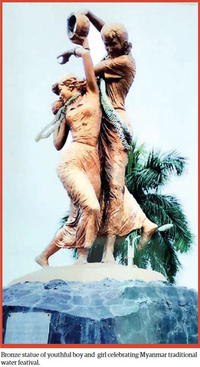 The majestic beauty of Yangon central railway station with its Myanmar architectural designs was enhanced further by the bronze statues of a youthful boy and girl celebrating tradi-tional Myanmar Thingyan in the present modern day outfits. The statues were erected in a small park in front of the station.