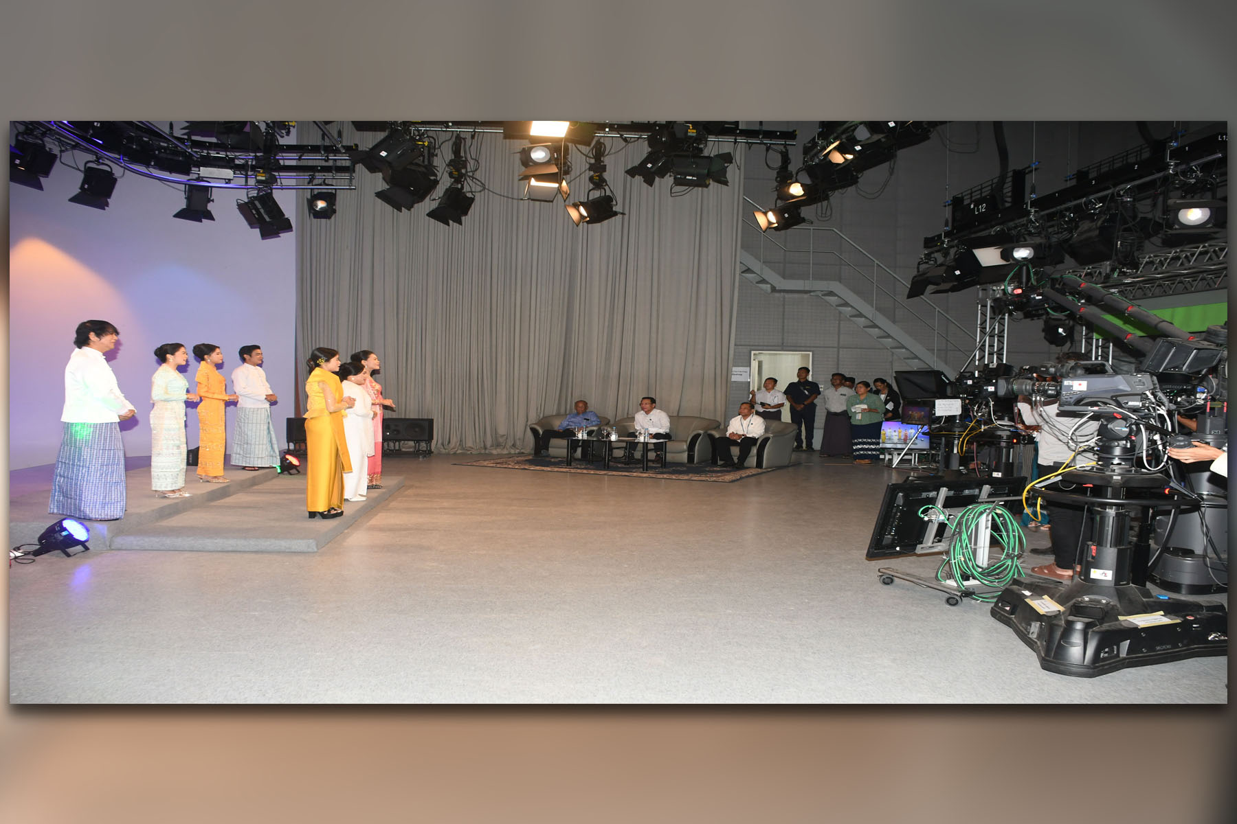 UNION Minister for Information U Maung Maung Ohn watched the filming processes of the Myanmar Music Association (Central) for awareness songs to promote a successful election for the 2025 multiparty democracy general election at MRTV in Yangon yesterday.