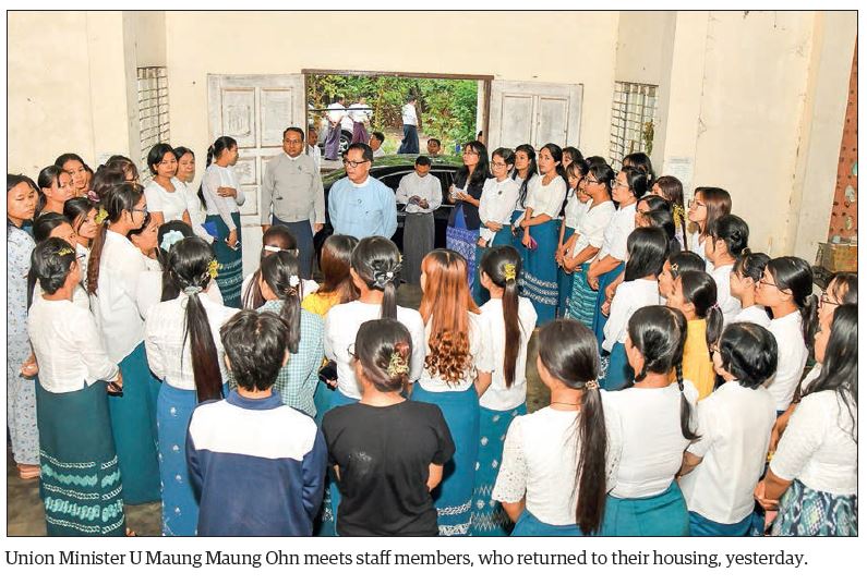 The Union minister first met staff members who returned to live at Thazin 7 and Thazin 1 dormitories for female staff in Zabuthiri and Bawga Theikdi wards and inspected the damage, relocation, and access to electricity and water.