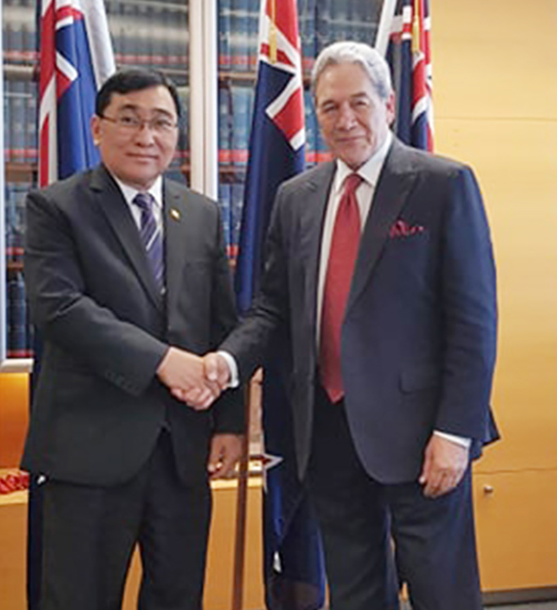 Union Minister for Social Welfare, Relief and Resettlement Dr Win Myat Aye held a meeting with Minister for Foreign Affairs and Trade Mr Winston Peters at Wellington in New Zealand yesterday.