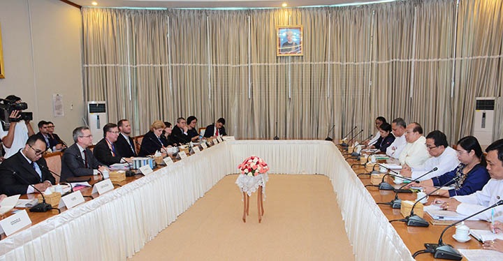 Union Minister for Investment and Foreign Economic Relations U Thaung Tun received a delegation led by the US Ambassador Scot Marciel and Mr Alexander C Feldman, President & CEO of the US-ASEAN Business Council at the Ministry of Investment and Foreign Economic Relations in Nay Pyi Taw yesterday morning.