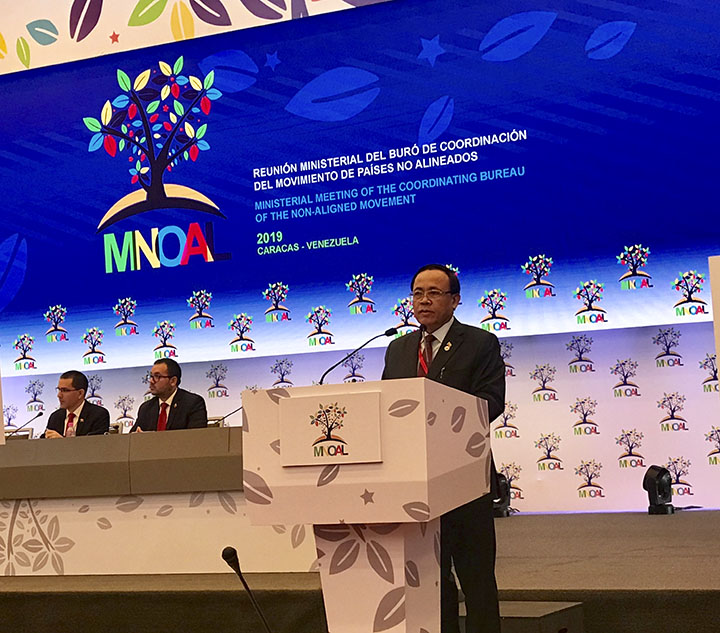 Union Minister for International Cooperation U Kyaw Tin participated at the Ministerial Meeting of the Coordination Bureau of the Non-Aligned Movement (NAM) held in Caracas, Venezuela from 20 to 21 July 2019 and delivered a statement in the debate under the theme “Promotion and Consolidation of Peace through Respect for International Law”. The Ministerial Meeting was presided over by the current Chair of the Movement, Minister of the People’s Power for Foreign Affairs of the Bolivarian Republic of Venezuela and attended by 78 Member States of the Movement and 4 observer States and 7 international organizations and 2 countries as special guests.
