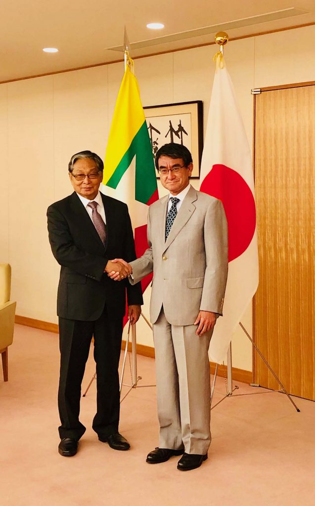 The Union Minister met with Japanese Foreign Minister Mr. Taro Kono at the Foreign Ministry in the evening. During the meeting, they exchanged views on promoting bilateral relations, internal peace process, economic cooperation, Bangladesh’s lack of cooperation to accept the ICoE’s proposal to go to Bangladesh although the agreement had been made with the Foreign Ministry and the latest development of the repatriation process in the Rakhine State. In his meeting, the Japanese Foreign Minister added that Japan would fully support with Myanmar’s democratization process and all-round development. The meeting was attended by Myanmar Ambassador to Japan U Thurain Thant Zin and officials. Following this, Union Minister U Kyaw Tint Swe attended a dinner hosted by the Chairman of the Japan-Myanmar Friendship Association and former Member of the House of Representatives Mr. Hideo Watanabe.—MNA (Translated by Win Ko Ko Aung)