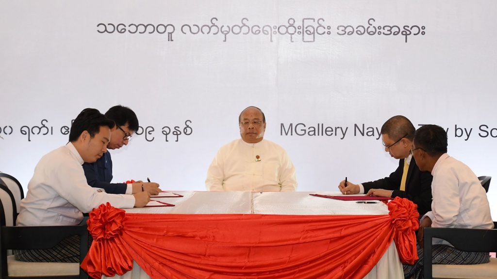 Union Minister for Investment and Foreign Economic Relations U Thaung Tun attended the Signing Ceremony of Loan Agreement on “The Pay Taw Village Layer Farm Project” —a joint undertaking of the Pay Taw Village Development Fund Association, Ayeyarwady Bank and Myanmar CP .Livestock Co.,Ltd. on Tuesday at 9 am at the M. Gallery Hotel in Nay Pyi Taw.