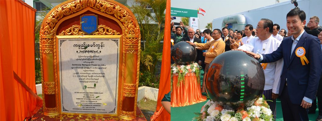 Union Minister for Electricity and Energy U Win Khaing attended the opening ceremony of a 225 Megawatt Natural Gas Power Plant, yesterday, which was held at the power plant near the Myingyan Steel Factory, Myingyan Township, Myingyan District, and Mandalay Region. The 225 Megawatt Natural Gas power Plant was built by Sembcorp Power Myanmar Co.Ltd.