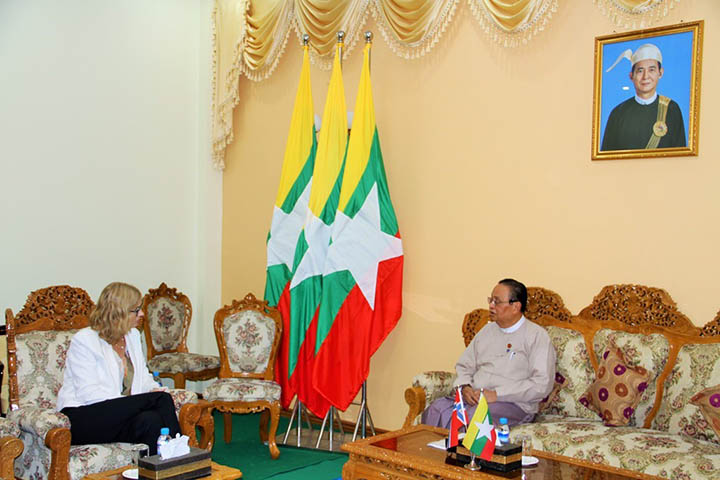 Union Minister for Electricity and Energy U Win Khaing received Norwegian Ambassador to Myanmar Ms Tone Tinnes at his office in Nay Pyi Taw yesterday morning.