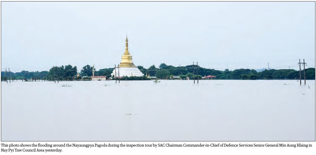 The Chairman of the State Administration Council Commander-in-Chief of Defence Services and officials viewed round damage in sown acreage of crops, the inflow of water at villages, inundation at the road section leading to Hlaykhwin Hill from Pinlaung junction and Yangon-Mandalay highway, waiting of cargo trucks and passenger buses on the roads by car from Thaikchaung Village to Yangon-Mandalay highway. The Senior General also viewed the flow of water in Hsinthay Creek from Kyaukchet Bridge crossing Hsinthay Creek. He inspected inundation at public residences in Wetkon Village and Pauktaw Village in Pobbathiri Township. The Senior General gave guidance to officials on how to remove the broken branches of trees caused by floods soon. If so, water will ebb. So, heavy machinery and manpower must be deployed at full capacity. Heavy machinery from ministries and Tatmadaw engineering corps must be used to clear the drains for the proper flow of water. It is necessary to manage rescue, relief and rehabilitation measures as quickly as possible, he added.