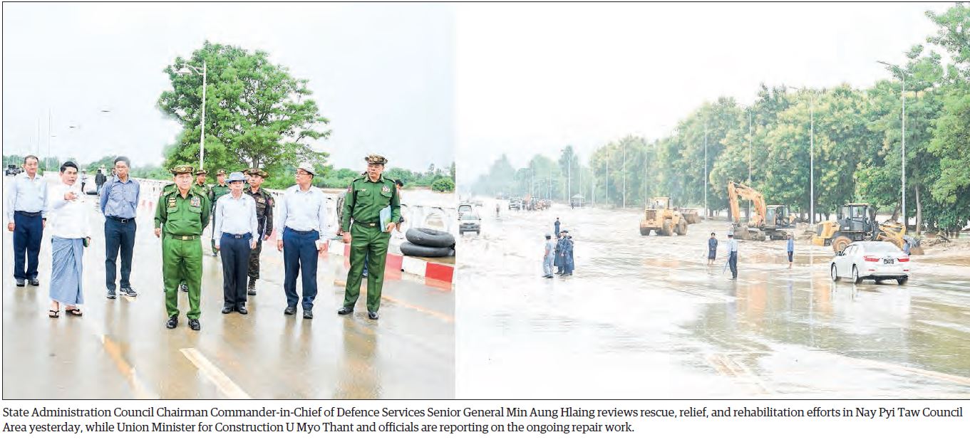 Chairman of the State Administration Council Commander-in-Chief of Defence Services Senior General Min Aung Hlaing and officials inspected rescue and relief works, repairing roads and bridges caused by floods and flash floods yesterday afternoon.