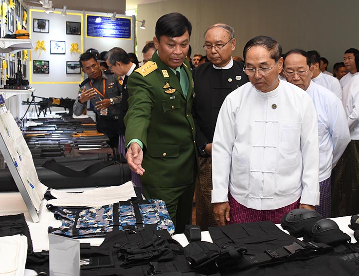 Next Vice President U Myint Swe and attendees posed for commemorative group photos and inspected the photographic records and exhibits of the Myanmar Police Force equipment, uniform, arms, machinery, drug detecting devices and vehicles.