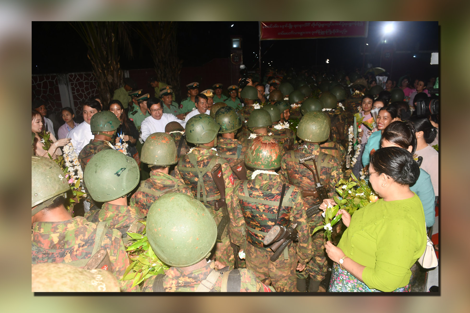 At the welcoming ceremony, the victorious returning soldiers marched into their respective battalion headquarters accompanied by a military band. Yangon Region Chief Minister U Soe Thein and his wife, Yangon Command Commander Maj-Gen Pyae Sone Lin and his wife, members of the regional government and their wives, officials, artistes, ethnic community members, and the public greeted them with garlands, and the chief minister presented cash awards to the victorious Tatmadaw members. — Zwe Htet Ko (IPRD)/GNLM