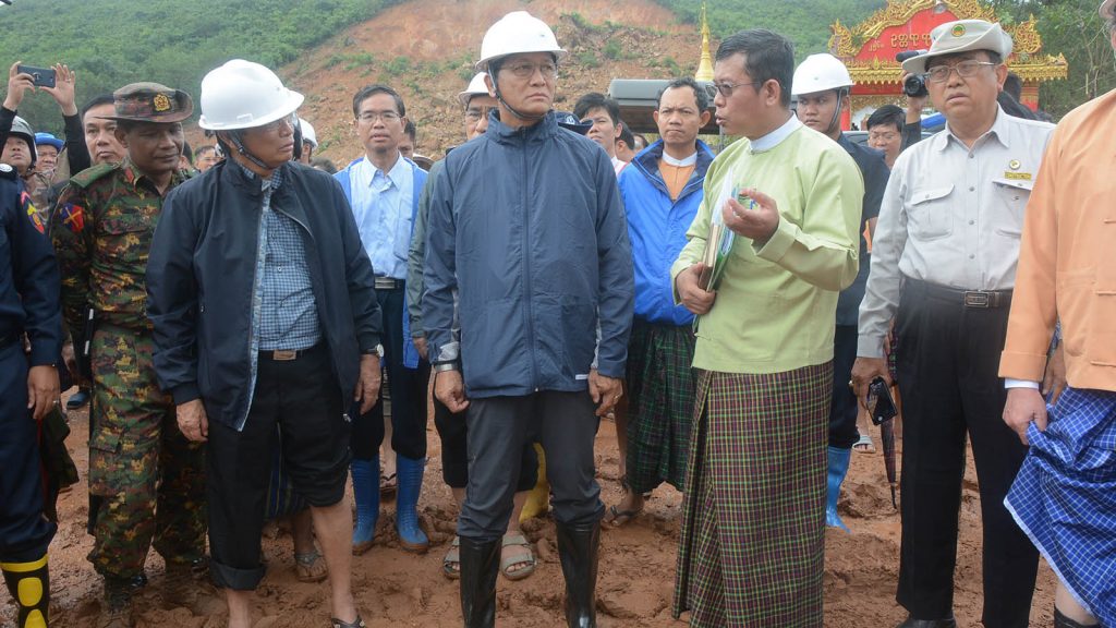 From there, the Vice President and party went to Mon State Paung Township The Phyu Gon Village where torrential rains on 9 August caused a landslide. The Vice President and party cordially greeted the Tatmadaw, Police, Fire Department and Red Cross personnel, civil society organizations and locals conducting relief, rescue and recovery works and provided cash assistance.