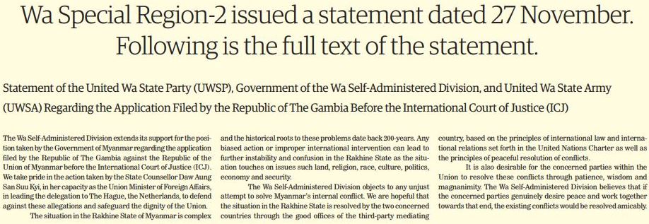 The Wa Self-Administered Division extends its support for the position taken by the Government of Myanmar regarding the application filed by the Republic of The Gambia against the Republic of the Union of Myanmar before the International Court of Justice (ICJ). We take pride in the action taken by the State Counsellor Daw Aung San Suu Kyi, in her capacity as the Union Minister of Foreign Affairs, in leading the delegation to The Hague, the Netherlands, to defend against these allegations and safeguard the dignity of the Union.