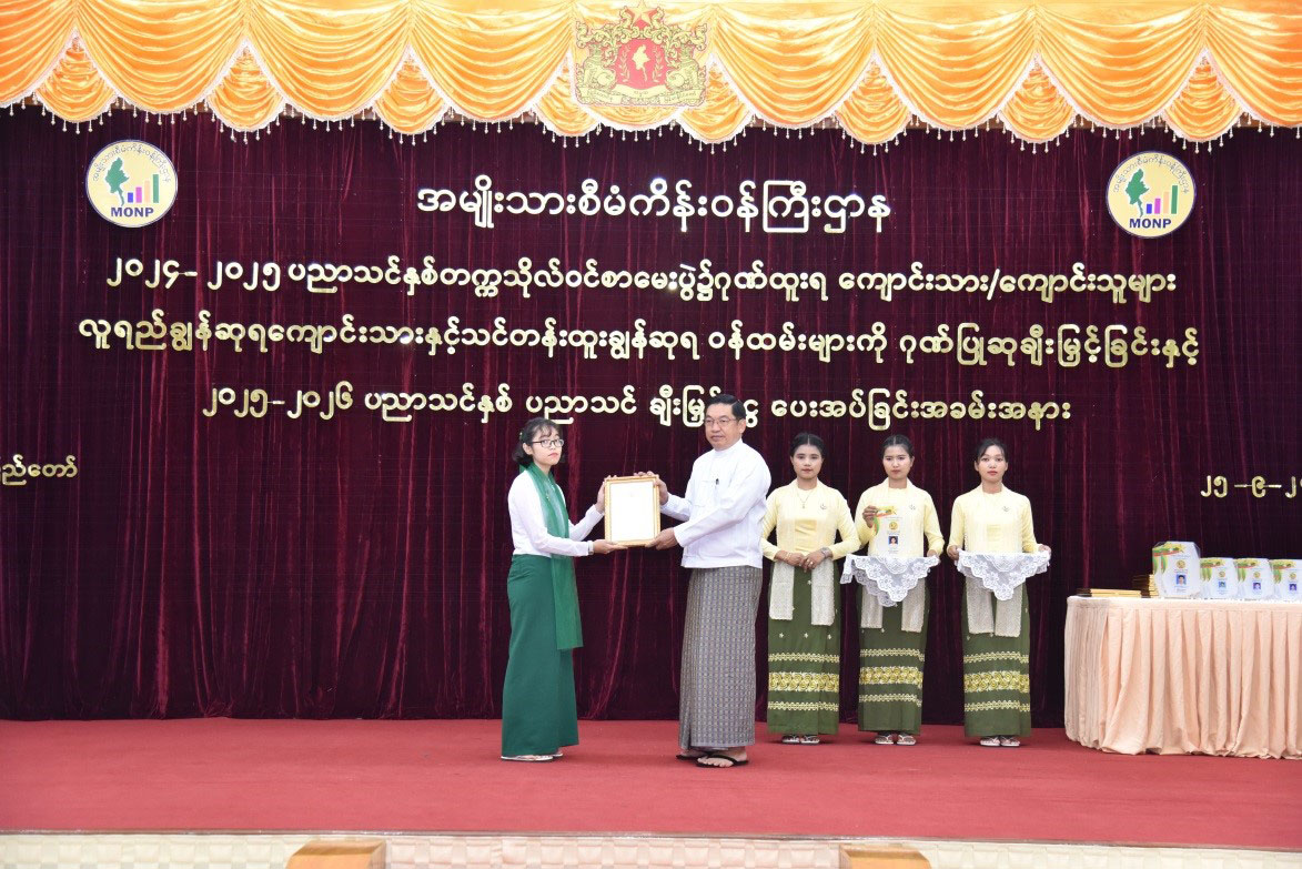 A ceremony to honour the offspring of service personnel from the Ministry of National Planning who passed the matriculation examination in the 2024- 25 academic year, outstanding award-winning students and outstanding staff in training courses took place in conjunction with the stipend-providing ceremony for 2025-26 AY at the hall of the ministry in Nay Pyi Taw yesterday afternoon.