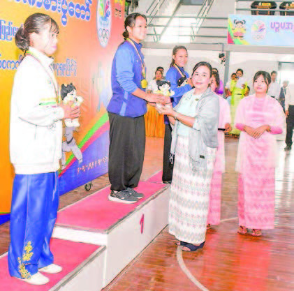 An awarding ceremony for the Wushu final was also held at the Shwekyapin sports ground. Among the spectators were Shan State Social Affairs Minister U Min Min Lwin, Chin State Transport Minister U Nay Lin Aung, and Deputy Minister Dr Wah Wah Maung. They pre­sented awards to winners from Mandalay, Magway, Bago, Shan, Kayin and Yangon teams for both men’s and women’s events of Wushu.
