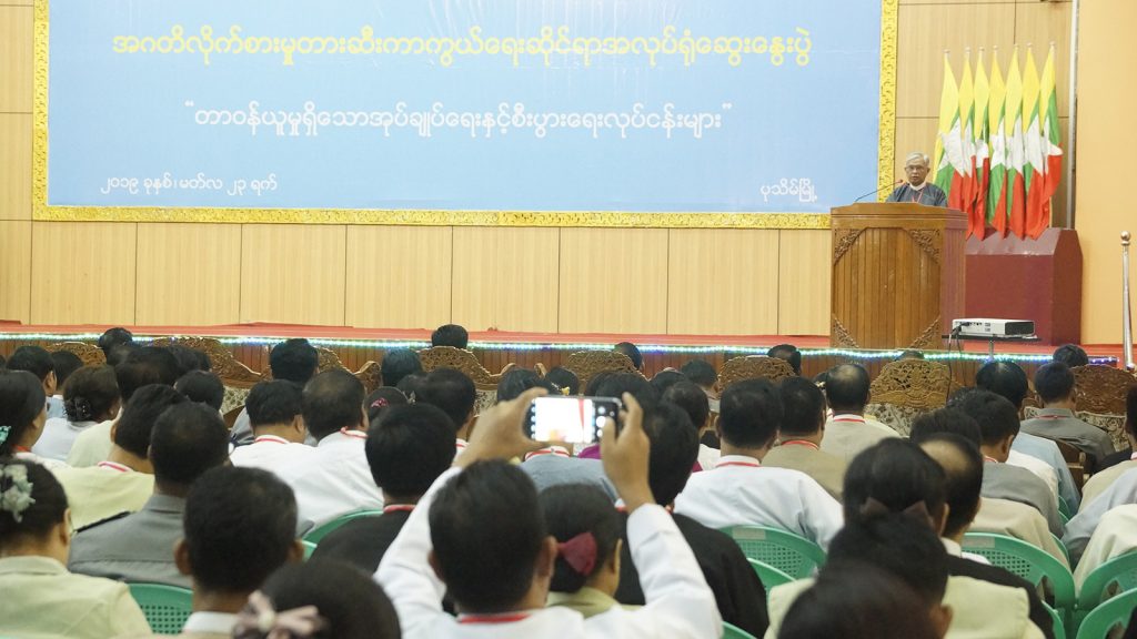 Then Chairman of the Anti-Corruption Commission and Regional Chief Minister posed for documentary photographs together. Next, member of the Anti-Corruption Commission U Soe Tint discussed a topic titled, “Measurements of Anti-Corruption Commission”, regional minister for Planning and Finance U Htay Win discussed a topic titled, “Accountable Governance Sector”, Dr. Tin Maung Than (Thank Bawa) discussed a topic titled, “Accountability of Governing Sector”, Dr. Zaw Oo discussed a topic titled, “The Role of CSO Accountability”, U Win Myint Aung from the Merchants and Industry Association discussed a topic titled, “Accountability for Economic Sector”, and local business personnel U Win Myint Hlaing discussed a topic titled, “Accountable Business Enterprises”.
