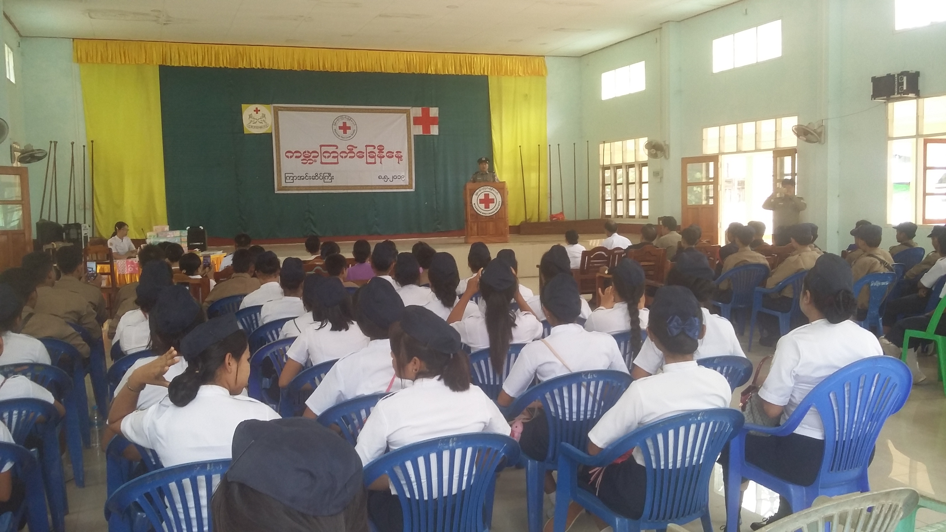 Firstly, the head of the township police force Police Major Win Naing delivered an address and the chairperson of the township Red Cross Society U Myint Soe read out the message sent by the President of the Myanmar Red Cross Society Prof. Dr. Myat Thu. Next, members of the township Red Cross Society demonstrated activities being carried out the MRCS.