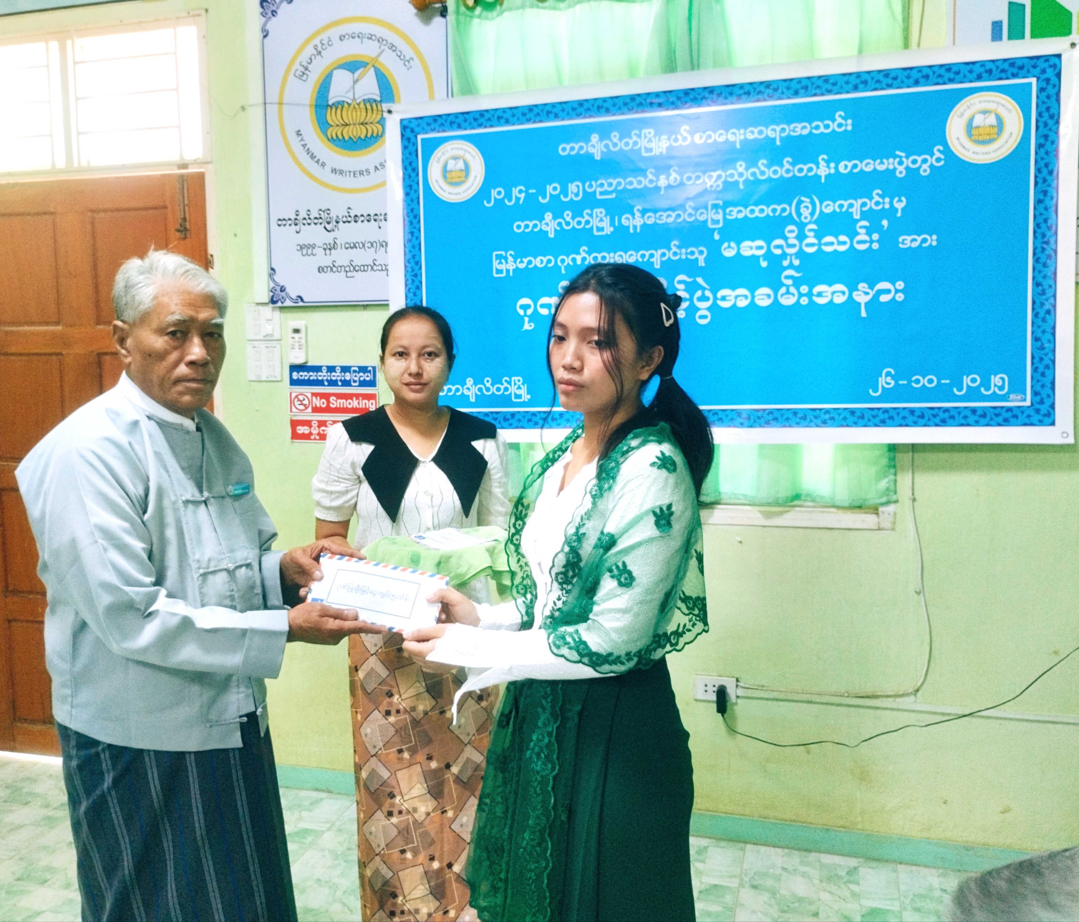 The Tachilek Township Writers Association held a ceremony on 26 October at Yan Aung Myay Sub-Basic Education School to honor a student who earned distinction in Myanmar literature in the 2024–2025 matriculation examination and the teacher who guided the student to success.