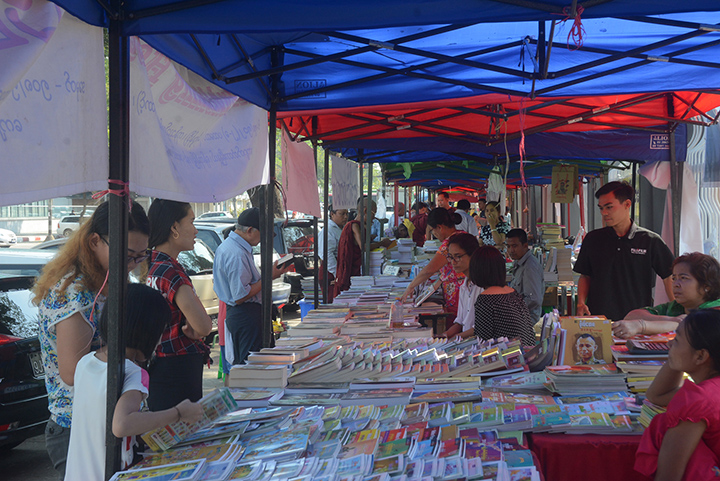 “The Saturday-Sunday Book Street” with some 80 book stalls selling books on Theinbyu Road in Botahtaung Township is crowded with visitors every weekend.
