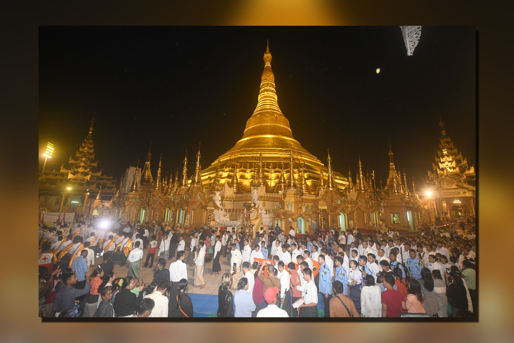 The Shwedagon Pagoda Board of Trustees organized the 1387 Myanmar Era Thadingyut Full Moon Day (Samañaphala Day) ceremony in the morning at designated venues on the pagoda platform. Yangon Region Chief Minister U Soe Thein, the commander of Yangon Command, regional ministers, members of the board of trustees, officials, members of religious associations, contestants of the 37th Matho Robe-Weaving Contest, and residents attended the event. They carried golden Kathina robes and offerings, and circumambulated the pagoda from the Aung Myay platform before paying homage to the Buddha images.