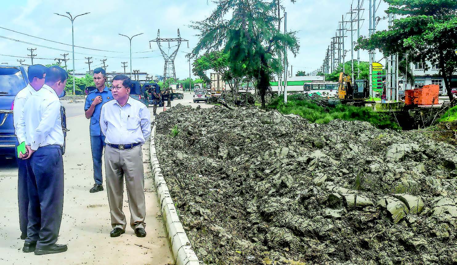 Chairman of the State Administration Council, Prime Minister Senior General Min Aung Hlaing, accompanied by Council Joint Secretary General Ye Win Oo, the Yangon Region Chief Minister, the commander of Yangon Command and officials, inspected efforts to ensure proper flow of water along both sides of Yangon-Pathein Road in Hlinethaya Township of Yangon Region yesterday morning.