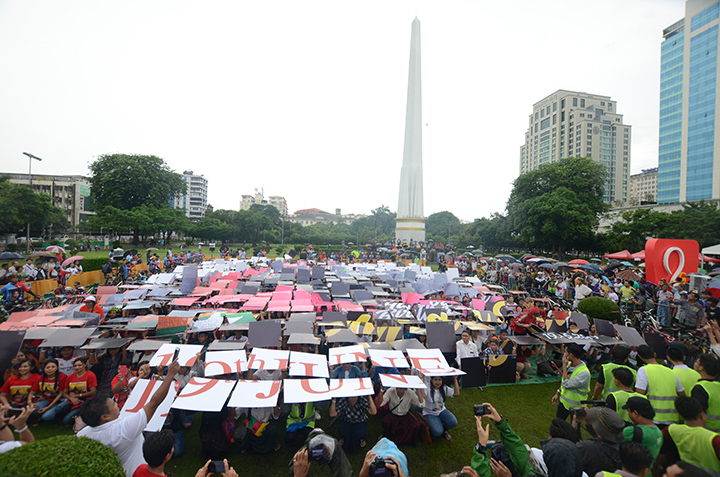 At 7:40 a.m., 740 people assembled to form a portrait of the State Counsellor at the Maha Bandoola Park downtown.