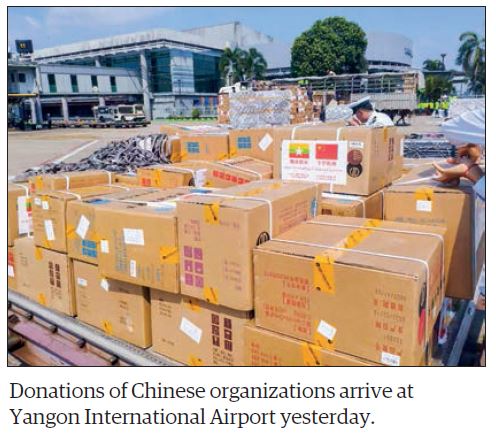 These relief supplies were transported from Kunming, China, to Yangon, Myanmar, arriving on 20 April. Responsible personnel of the China-Myanmar Cooperation and Communications Centre handed over the medical supplies to the Ministry of Health. — MNA/KNN