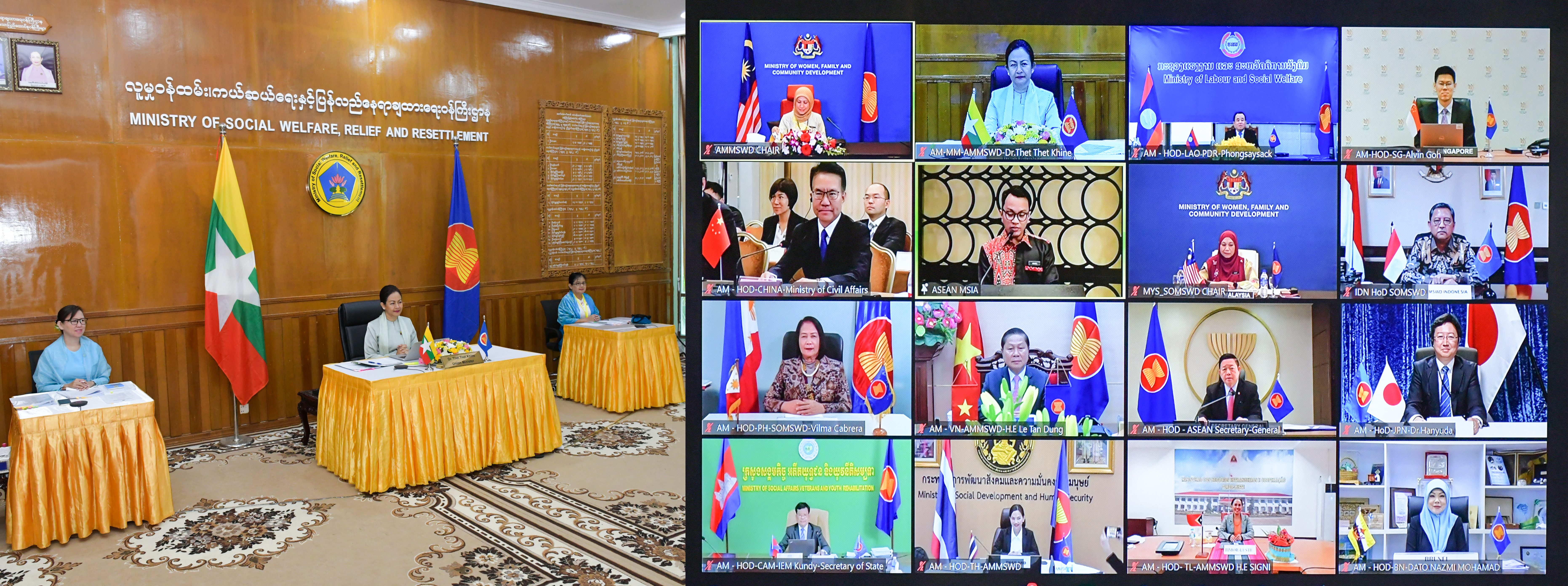 မလေးရှားနိုင်ငံမှ အိမ်ရှင်အဖြစ် လက်ခံကျင်းပသည့် (၁၁)ကြိမ်မြောက် အာဆီယံလူမှု ဝန်ထမ်းနှင့် ဖွံ့ဖြိုးတိုးတက်ရေးဆိုင်ရာ ဝန်ကြီးများအဆင့်အစည်းအဝေးနှင့် (၇)ကြိမ်မြောက် အာဆီယံ လူမှုဝန်ထမ်းနှင့် ဖွံ့ဖြိုးတိုးတက်ရေးဆိုင်ရာ ဝန်ကြီးများနှင့် အာဆီယံ+၃ နိုင်ငံများ အစည်းအဝေး(11th ASEAN Ministerial Meeting on Social Welfare and Development and 7th ASEAN Plus Three Ministerial Meeting on Social Welfare and Development- 11th AMMSWD Meeting and 7th AMMSWD+3) ကိုယနေ့တွင် Video Conferencing စနစ်ဖြင့် ကျင်းပရာ လူမှုဝန်ထမ်း၊ ကယ်ဆယ်ရေးနှင့် ပြန်လည်နေရာချထားရေးဝန်ကြီးဌာန၊ ပြည်ထောင်စုဝန်ကြီး ဒေါက်တာသက်သက်ခိုင်၊ လူမှုဝန်ထမ်းဦးစီးဌာန ညွှန်ကြားရေးမှူးချုပ်၊ ဒုတိယညွှန်ကြားရေးမှူးချုပ်၊ ညွှန်ကြားရေးမှူးများနှင့် ဘာသာရပ်ဆိုင်ရာ တာဝန်ခံများပါဝင် တက်ရောက်ခဲ့ကြသည်။