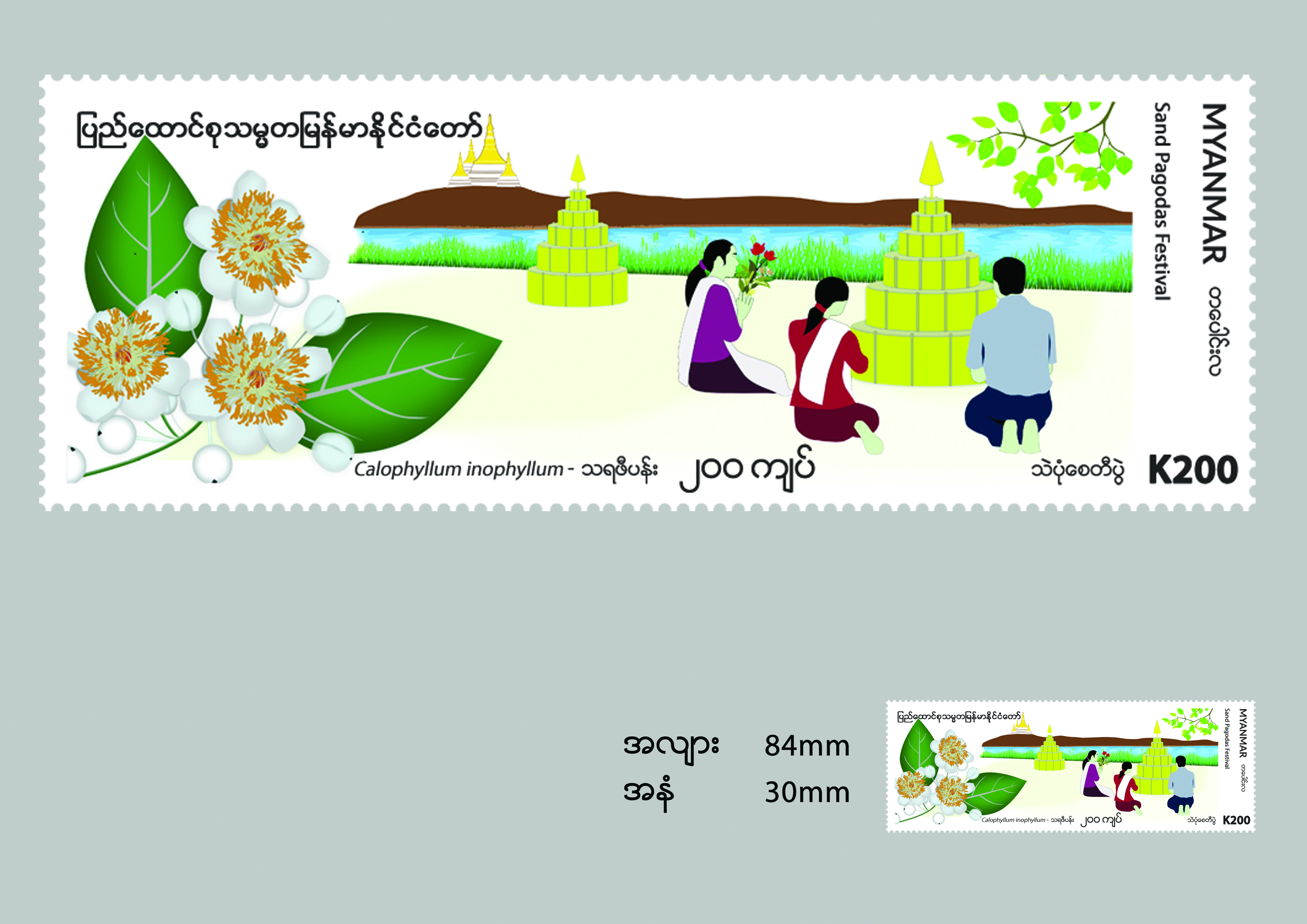 ပို့ဆောင်ရေးနှင့်ဆက်သွယ်ရေးဝန်ကြီးဌာန မြန်မာ့စာတိုက်လုပ်ငန်းမှ (၁၂)လ ရာသီပွဲတော်များနှင့်ပန်းများ အထိမ်းအမှတ် တပေါင်းလအတွက် သဲပုံစေတီပွဲနှင့် သရဖီပန်း ၂၀ဝ ကျပ်တန် အထူးထုတ်စာပို့ တံဆိပ်ခေါင်းသစ်(၁)မျိုးအား ၂၀၁၉ ခုနှစ်၊ မတ်(၆)ရက် မြန်မာသက္ကရာဇ် ၁၃၈၀ပြည့်နှစ် တပေါင်းလဆန်း(၁)ရက် ဗုဒ္ဓဟူးနေ့ နံနက် ၉နာရီခွဲ မှ စတင်၍ တိုင်းဒေသကြီး/ပြည်နယ်များရှိ လုပ်ငန်းပြည့်စာတိုက်အသီးသီးတွင် ရောင်းချ ပေးသွားမည်ဖြစ်သည်။