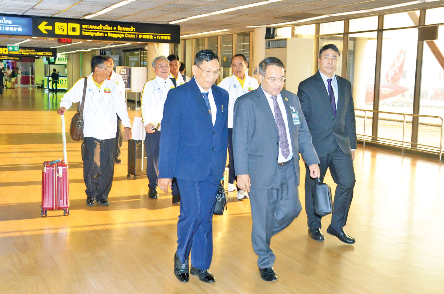 အဆိုပါအဖွဲ့သည် ထိုင်းနိုင်ငံ ဒွန်မောင်းအပြည်ပြည်ဆိုင်ရာ လေဆိပ်သို့ ဒေသစံတော်ချိန် နံနက် ၆ နာရီ ၄၅ မိနစ်တွင် ရောက်ရှိကြရာ ထိုင်းနိုင်ငံဆိုင်ရာ မြန်မာသံအမတ်ကြီး ဦးဇော်ဇော်စိုးနှင့် စစ်သံမှူး ဗိုလ်မှူးချုပ် ဝင်းသူလင်းတို့က လာရောက်ကြိုဆိုကြသည်။