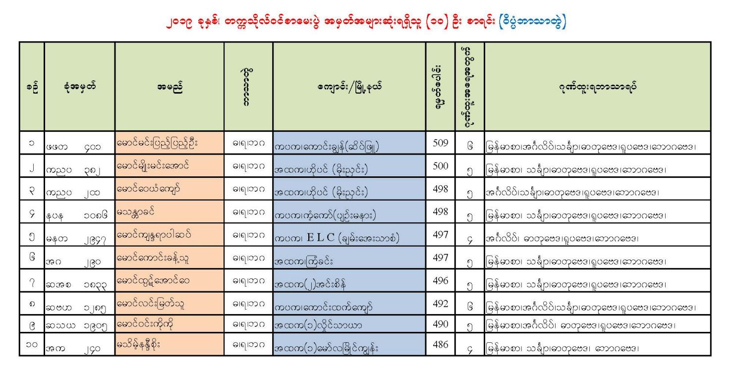 ၂၀၁၉ ခုနှစ်၊ တက္ကသိုလ်ဝင်စာမေးပွဲ ဝိပ္ပံဘာသာတွဲတွင် အမှတ်အများဆုံးရရှိသူ (၁၀)ဦး