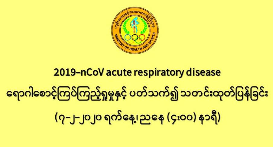 ၁။ ကျန်းမာရေးနှင့်အားကစားဝန်ကြီးဌာနသည် 2019-nCoV အသက်ရှူလမ်းကြောင်းဆိုင်ရာ ရောဂါစောင့်ကြပ်ကြည့်ရှုခြင်းလုပ်ငန်းများအား အရှိန်အဟုန်မြှင့်ဆောင်ရွက်လျက်ရှိရာ (၂၄)နာရီ ဆက်သွယ်နိုင်သော တယ်လီဖုန်းနံပါတ်(Hotline) များထားရှိ၍ ပြည်သူလူထုမှ ပေးပို့သောသတင်းများအားရယူကာ ကွင်းဆင်းစစ်ဆေးအတည်ပြုခြင်း၊ သတင်းမှန်ပြန်ကြားခြင်း၊ ကျန်းမာရေး အသိပညာပေးခြင်း၊ လူမှုကွန်ရက်နှင့် အင်တာနက်စာမျက်နှာများတွင် ပျံ့နှံ့နေသောသတင်းများအား စောင့်ကြည့်၍ တိုင်းဒေသကြီး၊ ပြည်နယ်၊ ခရိုင်နှင့် မြို့နယ်ပြည်သူ့ ကျန်းမာရေးနှင့် ကုသရေးဦးစီးဌာနများမှ ကွင်းဆင်းစစ်ဆေးအတည်ပြုခြင်း စသည့်လုပ်ငန်းများကို ဆောင်ရွက်လျက်ရှိပါသည်။