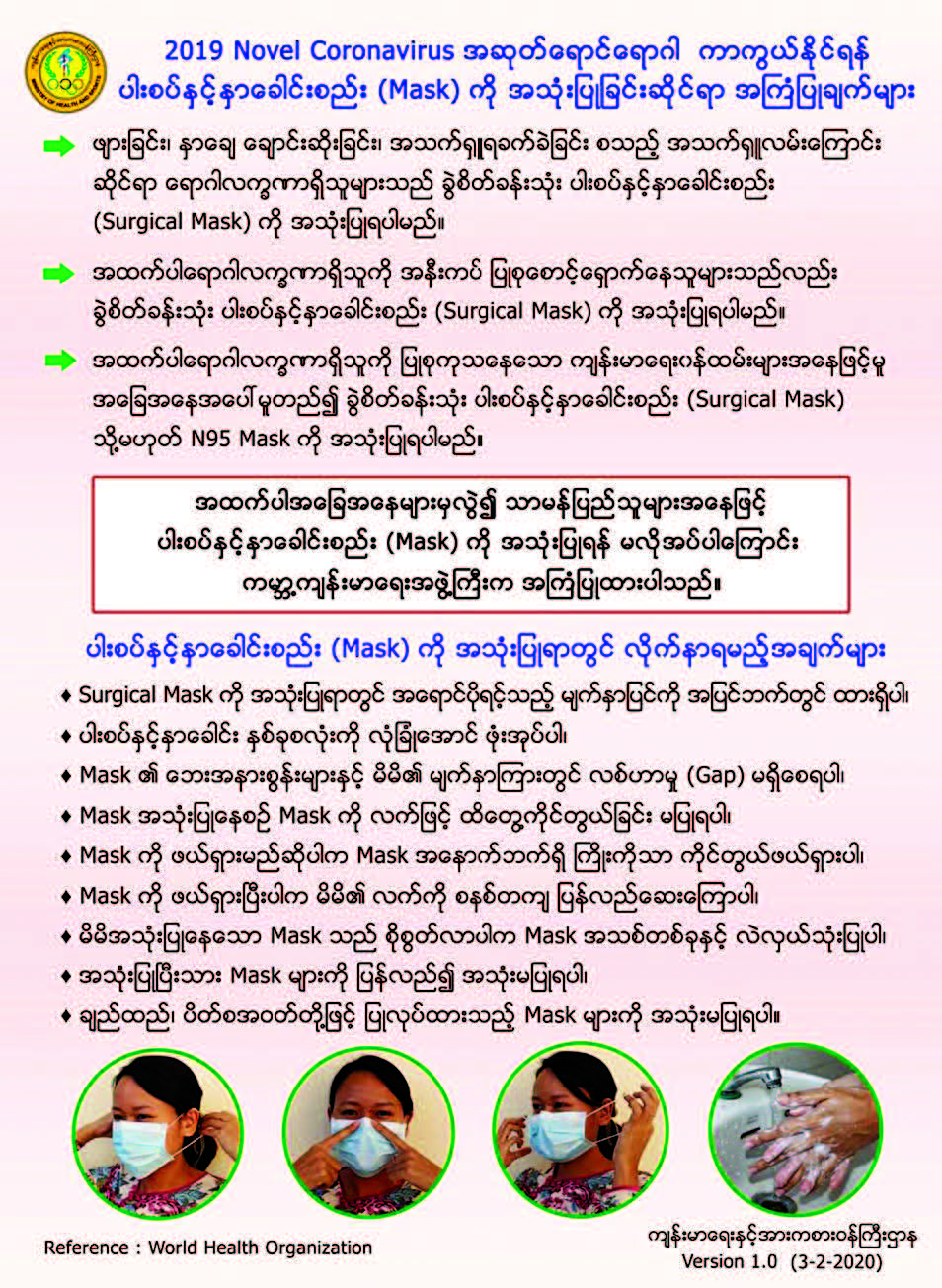 2019 Novel Coronaviurs အဆုတ်ရောင်ရောဂါ ကာကွယ်နိုင်ရန် ပါးစပ်နှင့် နှာခေါင်းစည်း (Mask) ကိုအသုံးပြုခြင်းဆိုင်ရာ အကြံပြုချက်များ