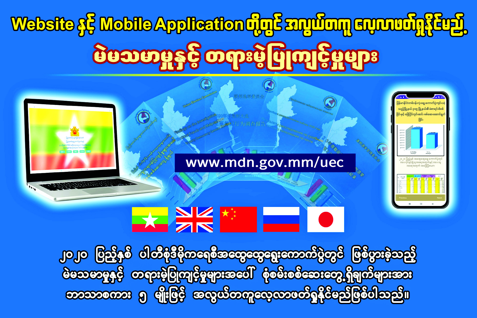 ၂၀၂၀ ပြည့်နှစ် ပါတီစုံဒီမိုကရေစီ အထွေထွေရွေးကောက်ပွဲတွင် ဖြစ်ပွားခဲ့သည့် “မဲမသမာမှုနှင့် တရားမဲ့ပြုကျင့်မှုများ” အပေါ် စုံစမ်းစစ်ဆေး တွေ့ရှိချက်များနှင့် စပ်လျဉ်း၍ ပြည်တွင်း၊ ပြည်ပမှ လေ့လာလိုသူများအနေဖြင့် www.mdn.gov.mm/uec တွင် မြန်မာ၊ အင်္ဂလိပ်၊ တရုတ်၊ ရုရှား၊ ဂျပန် စသည့် ဘာသာစကား (၅)မျိုးဖြင့် လွှင့်တင်ထားပြီး Mobile Application ကိုလည်း Download ရယူ၍ လေ့လာဖတ်ရှုနိုင်ပါသည်။