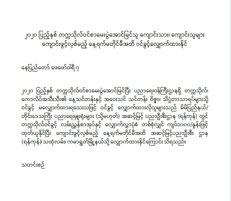 ၂၀၂၀ ပြည့်နှစ် တက္ကသိုလ်ဝင်စာမေးပွဲအောင်မြင်ပြီး ပညာရေးဝန်ကြီးဌာနရှိ တက္ကသိုလ်၊ ကောလိပ်အသီးသီး၏ နေ့သင်တန်းနှင့် အဝေးသင် သင်တန်း ဝိဇ္ဇာ၊ သိပ္ပံဘာသာရပ်များသို့ ဝင်ခွင့် မလျှောက်ထားရသေးသဖြင့် ဝင်ခွင့် လျှောက်ထားလိုသူများသည် မိမိပြည်နယ်/ တိုင်းဒေသကြီး ပညာရေးမှူးရုံးများ (သို့မဟုတ်) အဆင့်မြင့် ပညာဦးစီးဌာန (ရန်ကုန်) တွင် တက္ကသိုလ်ဝင်ခွင့် လမ်းညွှန်စာအုပ်နှင့် လျှောက်လွှာပုံစံ တစ်စုံလျှင် ကျပ်၁၀၀၀/နှုန်းဖြင့် ထုတ်ယူနိုင်ပြီး ကျောင်းဖွင့်လှစ်မည့် နေ့ရက်မတိုင်မီအထိ အဆင့်မြင့်ပညာဦးစီး ဌာန (ရန်ကုန်)၊ သထုံလမ်း၊ ကမာရွတ်မြို့နယ်သို့ လျှောက်ထားနိုင်ကြောင်း သိရသည်။