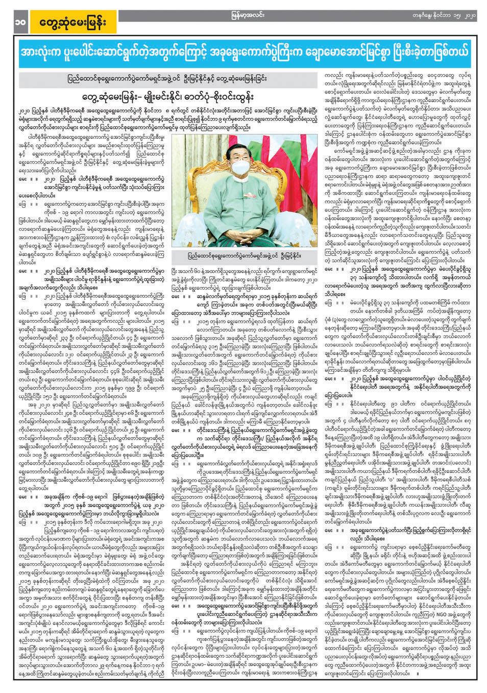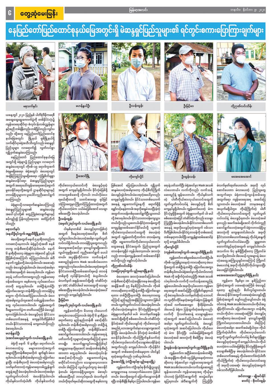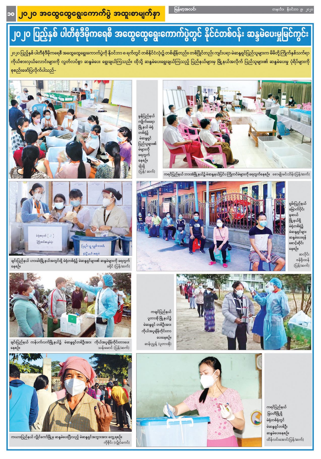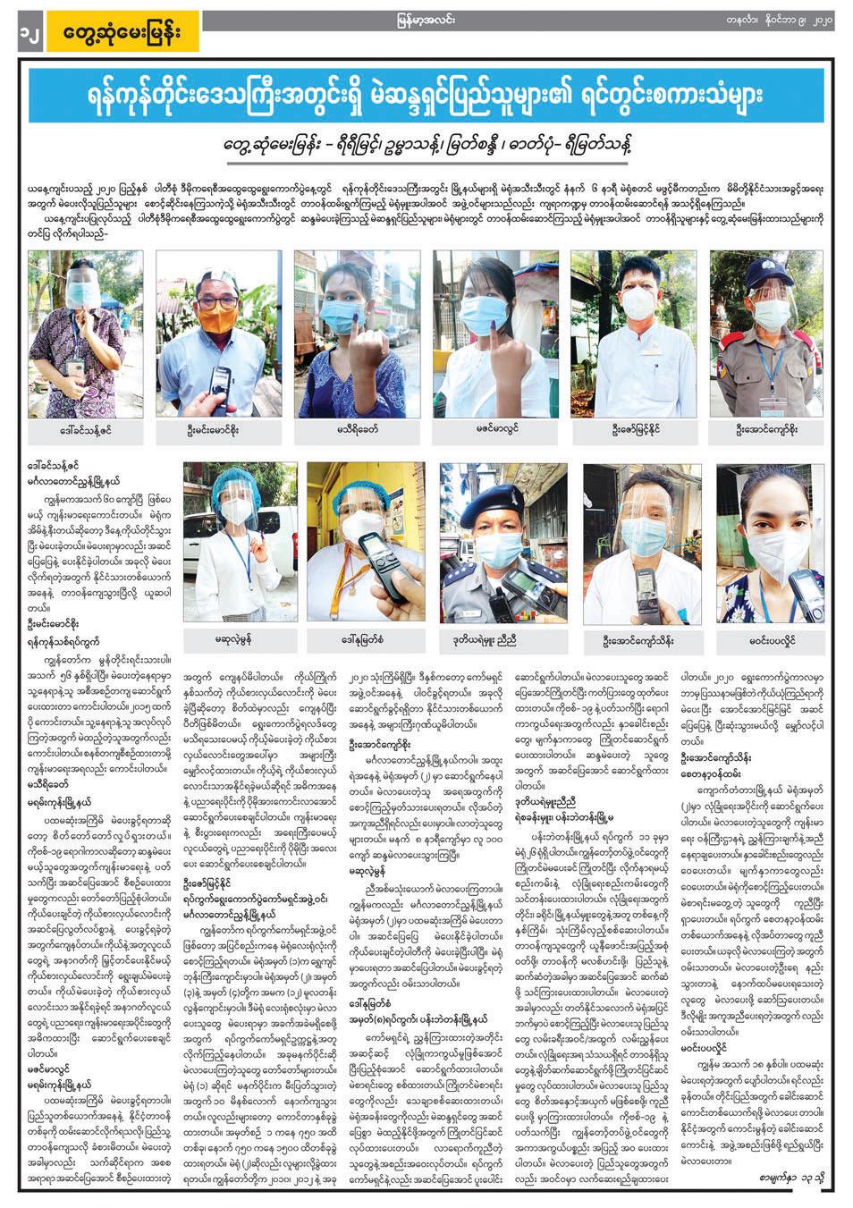 ဆန္ဒမဲပေးပြီး နောက်တစ်နေ့ (နိုဝင်ဘာ ၉ ရက်ထုတ်) နိုင်ငံပိုင်သတင်းစာ များတွင် ကိုဗစ်-၁၉ ရောဂါအတွက် ထုတ်ပြန်ထားသည့် လမ်းညွှန်ချက်များ နှင့်အညီ ဆန္ဒမဲလာရောက်ပေးသူများ၏ ရင်တွင်းစကားသံများ၊ ဆန္ဒမဲပေးမှု မြင်ကွင်းများကို ထည့်သွင်းဖော်ပြနိုင်ခဲ့ပြီး သမိုင်းတွင်မည့် နိုင်ငံတော်၏ အထူးနေ့ရက်ပုံရိပ်များအဖြစ် မှတ်တမ်းတင်နိုင်ခဲ့ပါသည်။ ထိုသို့ဖော်ပြရာတွင် နိုင်ငံတော်အကြီးအကဲများ၊ အစိုးရအဖွဲ့ဝင်များ၏ ကြိုတင်ဆန္ဒမဲ ပေးသည့် သတင်းများကို ဖော်ပြပေးသကဲ့သို့ ဝေးလံခေါင်ဖျားဒေသများတွင် ဆန္ဒမဲ ပေးနေသည့် သတင်းဓာတ်ပုံများ၊ သက်ကြီးဘိုးဘွားများ ကြိုတင်ဆန္ဒမဲ ပေးနေသည့် သတင်းဓာတ်ပုံများ၊ မသန်စွမ်းသူများနှင့် အမြင်အာရုံ မသန် စွမ်းသူများ အထူးစနစ်ဖြင့် ဆန္ဒမဲပေးသည့်သတင်းများ၊ မဲရေတွက်နေမှု မြင်ကွင်းများအပြင် နိုင်ငံတကာမှ ရွေးကောက်ပွဲစောင့်ကြည့်လေ့လာသူ များ၏ မှတ်တမ်းများ စသည်ဖြင့်ရွေးကောက်ပွဲဆိုင်ရာ ကဏ္ဍစုံ၊ လူတန်းစား အလွှာပေါင်းစုံ၊ နေရာစုံတို့မှ သတင်းနှင့် သတင်းမြင်ကွင်းများကို အများ ပြည်သူတို့ တွေ့မြင်ဖတ်ရှုနိုင်ရန်အတွက် ရွေးချယ်တည်းဖြတ် ဖော်ပြခဲ့ ရသည်မှာလည်း ငါးနှစ်တွင် တစ်ကြိမ်သာ ကြုံရသည့် အမှတ်တရအတွေ့ အကြုံများဖြစ်ပါသည်။