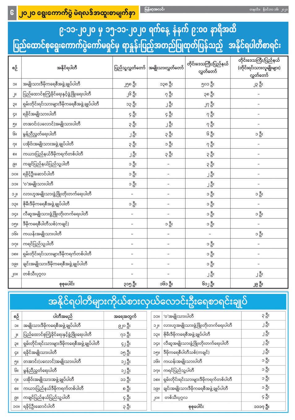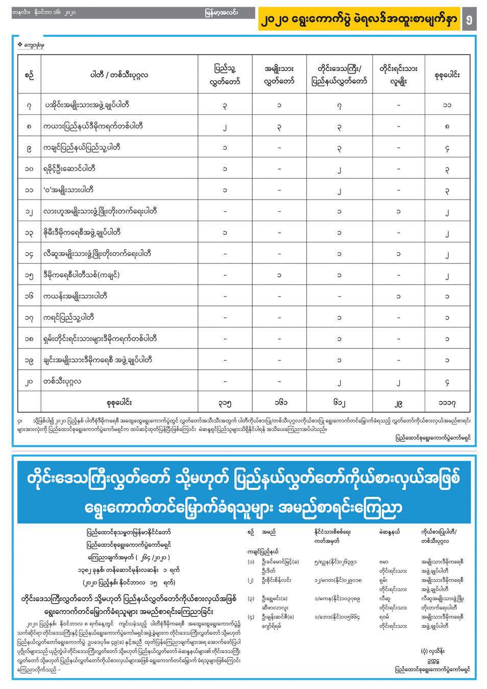 နိုဝင်ဘာ ၁၀ ရက်နေ့ထုတ်မှစတင်၍ ရွေးကောက်ပွဲကော်မရှင်က နေ့စဉ် ထုတ်ပြန်သည့် လွှတ်တော်အသီးသီးအတွက် ကိုယ်စားလှယ်အမည်စာရင်း များကို နိုင်ငံပိုင်သတင်းစာများတွင် ဖော်ပြခဲ့ပြီး မဲဆန္ဒနယ်အလိုက် ကိုယ်စား လှယ်များ၏ အမည်၊ မှတ်ပုံတင်အမှတ်၊ ကိုယ်စားပြုပါတီတို့ကို ဇယားများ ဖြင့် ရှင်းလင်းစွာဖော်ပြပေးခဲ့ပါသည်။