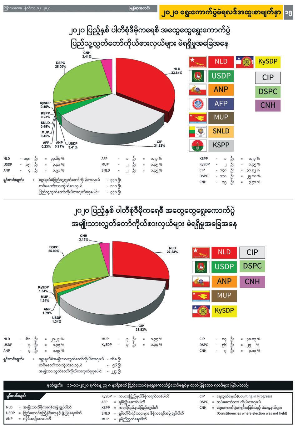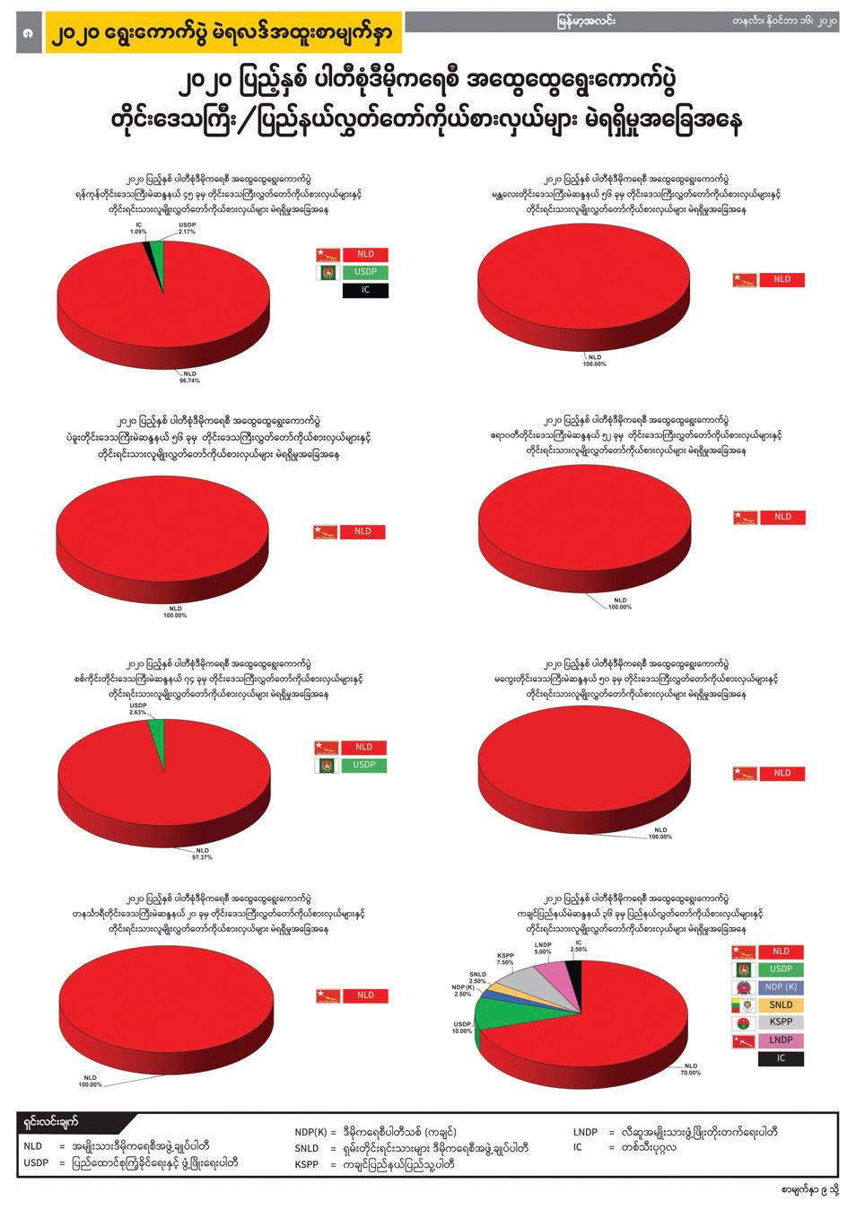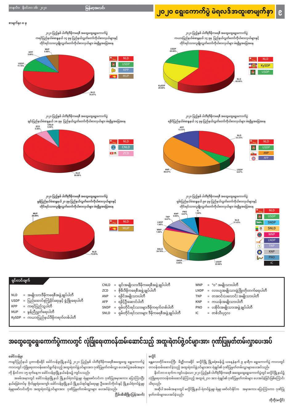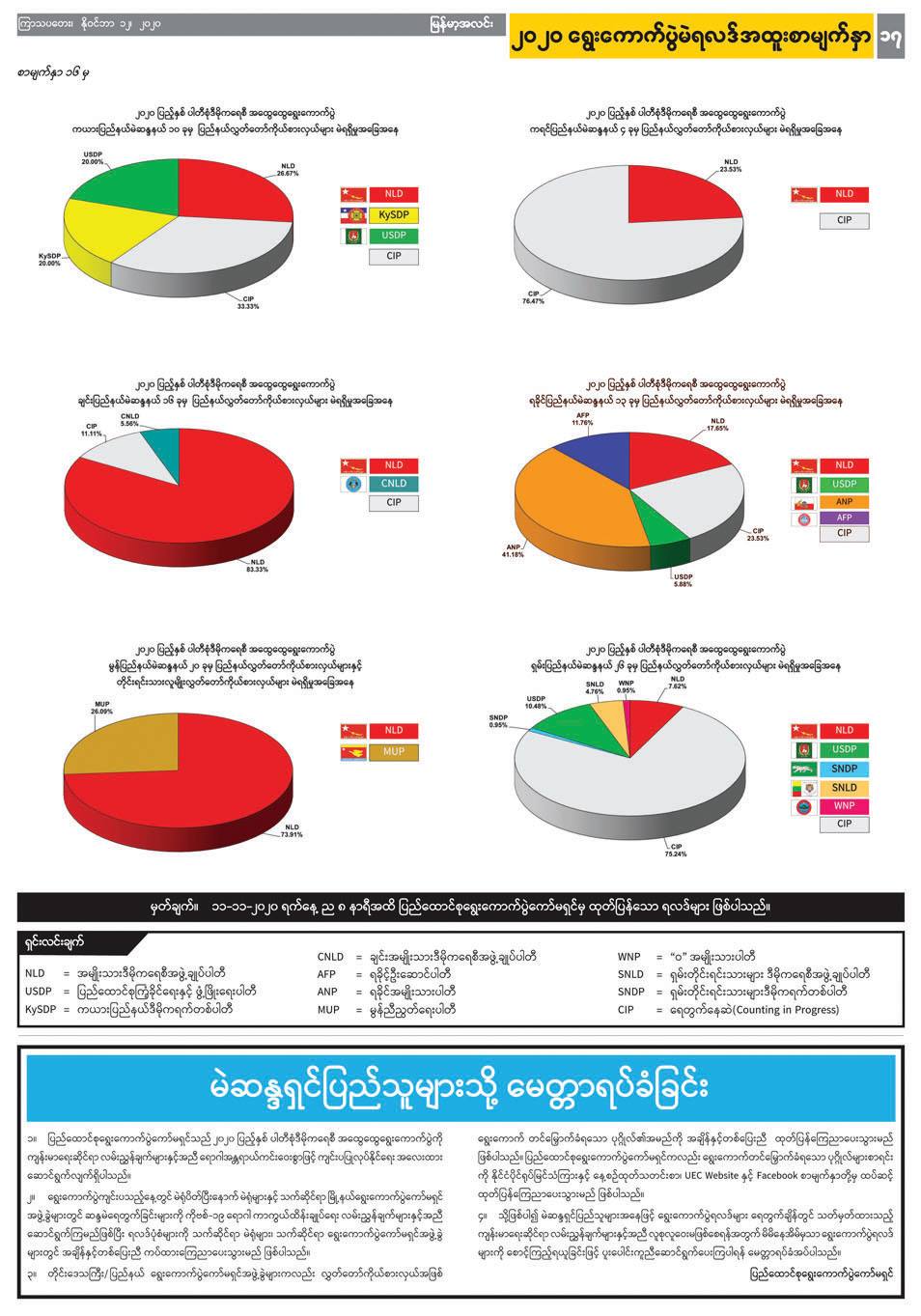 ရွေးကောက်ပွဲမတိုင်မီလများကပင် ကြိုတင်ပြင်ဆင်ထားခဲ့သလို ရွေးကောက်ပွဲ ရလဒ်များအား စာရင်းဇယားများဖြင့် တင်ဆက်ရန်၊ သို့မဟုတ် ပိုမိုရှင်းလင်းလွယ်ကူစွာ သိရှိနိုင်အောင် အခြေပြဇယား (ဂရပ်ဖ်ပုံ) များဖြင့် မြင်သာအောင် ပြသရန်အတွက် ရွေးကောက်ပွဲ အထူးစာမျက်နှာများကို ဖန်တီးရန် သီးသန့်တာဝန်ပေးထားသူများ၊ ရွေးချယ်ခံရသည့် ကိုယ်စားလှယ် လောင်းများစာရင်းကို အဆင့်ဆင့်စစ်ဆေးပေးနေသည့် တာဝန်ရှိသူများ၊ စာတည်းများ၊ စာပြင်များ၊ စာမျက်နှာဖွဲ့စည်းသူများ အားလုံးက ဆန္ဒမဲပေး သည့် နေ့ရက်မှ လွှတ်တော်အသီးသီးအတွက် ကိုယ်စားလှယ်များအားလုံး အတည်ပြုထွက်ပေါ်လာသည်အထိ အထူးဂရုပြုဆောင်ရွက်ခဲ့ကြခြင်းဖြင့် ပြည်သူများ၏ သတင်းသိပိုင်ခွင့်ကို ဖြည့်ဆည်းပေးခဲ့ကြသည်။